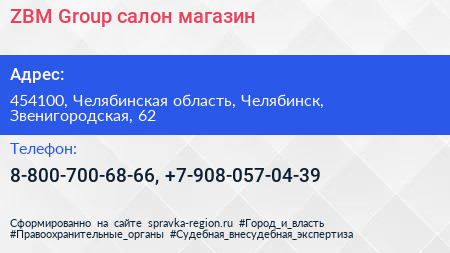 ZBM Group, салон-магазин по адресу 454100, Челябинская область, Челябинск, Звенигородская, 62 в дальнейшем Организация, размещена в следующих категориях: