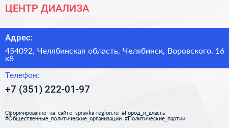 ЦЕНТР ДИАЛИЗА по адресу 454092, Челябинская область, Челябинск, Воровского, 16 к8 в дальнейшем Организация, размещена в следующих категориях: