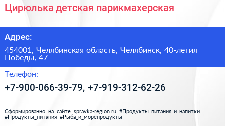 Цирюлька, детская парикмахерская по адресу 454001, Челябинская область, Челябинск, 40-летия Победы, 47 в дальнейшем Организация, размещена в следующих категориях: