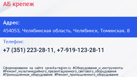 АБ-крепеж по адресу 454053, Челябинская область, Челябинск, Томинская, 8 в дальнейшем Организация, размещена в следующих категориях: