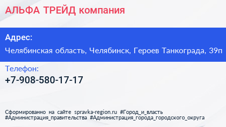 АЛЬФА-ТРЕЙД, компания по адресу Челябинская область, Челябинск, Героев Танкограда, 39п в дальнейшем Организация, размещена в следующих категориях: