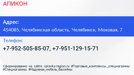 АПИКОН по адресу 454085, Челябинская область, Челябинск, Моховая, 7 в дальнейшем Организация, размещена в следующих категориях:
