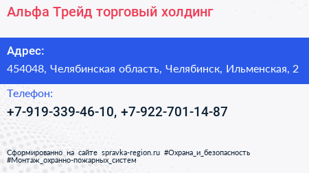 Альфа-Трейд, торговый холдинг по адресу 454048, Челябинская область, Челябинск, Ильменская, 2 в дальнейшем Организация, размещена в следующих категориях: