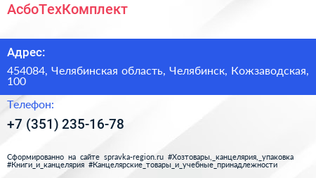 АсбоТехКомплект по адресу 454084, Челябинская область, Челябинск, Кожзаводская, 100 в дальнейшем Организация, размещена в следующих категориях: