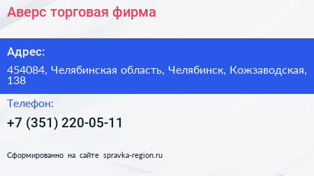 Аверс, торговая фирма по адресу 454084, Челябинская область, Челябинск, Кожзаводская, 138 в дальнейшем Организация, размещена в следующих категориях: