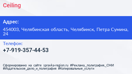 Ceiling по адресу 454003, Челябинская область, Челябинск, Петра Сумина, 24 в дальнейшем Организация, размещена в следующих категориях: