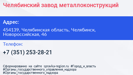 Челябинский завод металлоконструкций по адресу 454139, Челябинская область, Челябинск, Новороссийская, 46 в дальнейшем Организация, размещена в следующих категориях: