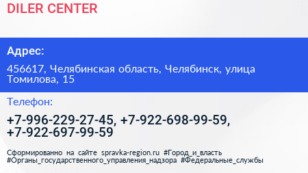 DILER.CENTER по адресу 456617, Челябинская область, Челябинск, улица Томилова, 15 в дальнейшем Организация, размещена в следующих категориях: