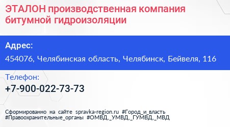 ЭТАЛОН, производственная компания битумной гидроизоляции по адресу 454076, Челябинская область, Челябинск, Бейвеля, 116 в дальнейшем Организация, размещена в следующих категориях: