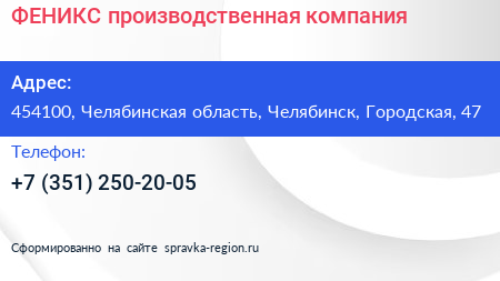 ФЕНИКС, производственная компания по адресу 454100, Челябинская область, Челябинск, Городская, 47 в дальнейшем Организация, размещена в следующих категориях: