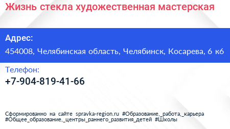 Жизнь стекла, художественная мастерская по адресу 454008, Челябинская область, Челябинск, Косарева, 6 к6 в дальнейшем Организация, размещена в следующих категориях: