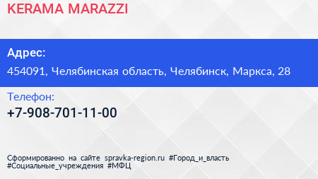 KERAMA MARAZZI по адресу 454091, Челябинская область, Челябинск, Маркса, 28 в дальнейшем Организация, размещена в следующих категориях:
