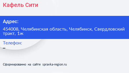 Кафель Сити по адресу 454008, Челябинская область, Челябинск, Свердловский тракт, 1ж в дальнейшем Организация, размещена в следующих категориях: