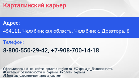 Карталинский карьер по адресу 454111, Челябинская область, Челябинск, Доватора, 8 в дальнейшем Организация, размещена в следующих категориях: