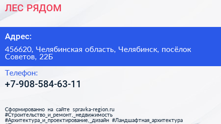 ЛЕС РЯДОМ по адресу 456620, Челябинская область, Челябинск, посёлок Советов, 22Б в дальнейшем Организация, размещена в следующих категориях: