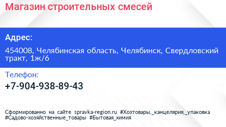 Магазин строительных смесей по адресу 454008, Челябинская область, Челябинск, Свердловский тракт, 1ж/6 в дальнейшем Организация, размещена в следующих категориях: