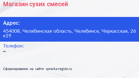 Магазин сухих смесей по адресу 454008, Челябинская область, Челябинск, Черкасская, 26 к19 в дальнейшем Организация, размещена в следующих категориях: