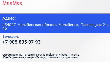 МалМех по адресу 454047, Челябинская область, Челябинск, Павелецкая 2-я, 46 в дальнейшем Организация, размещена в следующих категориях: