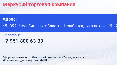 Меркурий, торговая компания по адресу 454092, Челябинская область, Челябинск, Курчатова, 19 к2 в дальнейшем Организация, размещена в следующих категориях: