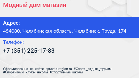 Модный дом, магазин по адресу 454080, Челябинская область, Челябинск, Труда, 174 в дальнейшем Организация, размещена в следующих категориях: