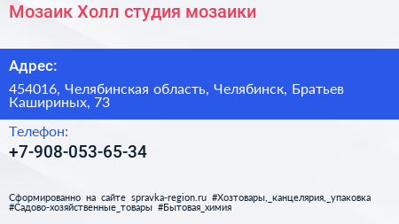 Мозаик Холл, студия мозаики по адресу 454016, Челябинская область, Челябинск, Братьев Кашириных, 73 в дальнейшем Организация, размещена в следующих категориях: