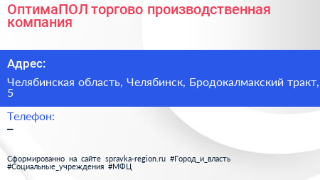 ОптимаПОЛ, торгово-производственная компания по адресу Челябинская область, Челябинск, Бродокалмакский тракт, 5 в дальнейшем Организация, размещена в следующих категориях: