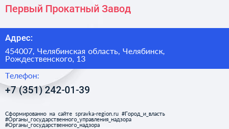 Первый Прокатный Завод по адресу 454007, Челябинская область, Челябинск, Рождественского, 13 в дальнейшем Организация, размещена в следующих категориях: