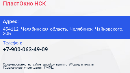 ПластОкно НСК по адресу 454112, Челябинская область, Челябинск, Чайковского, 20Б в дальнейшем Организация, размещена в следующих категориях: