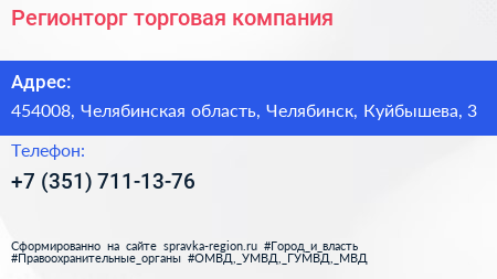 Регионторг, торговая компания по адресу 454008, Челябинская область, Челябинск, Куйбышева, 3 в дальнейшем Организация, размещена в следующих категориях:
