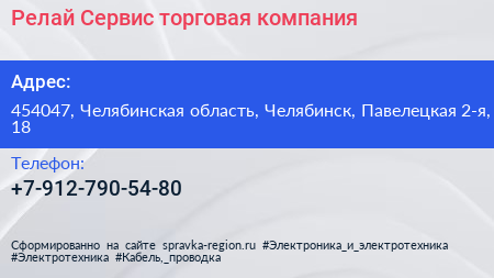 Релай-Сервис, торговая компания по адресу 454047, Челябинская область, Челябинск, Павелецкая 2-я, 18 в дальнейшем Организация, размещена в следующих категориях: