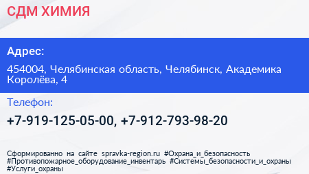 СДМ-ХИМИЯ по адресу 454004, Челябинская область, Челябинск, Академика Королёва, 4 в дальнейшем Организация, размещена в следующих категориях: