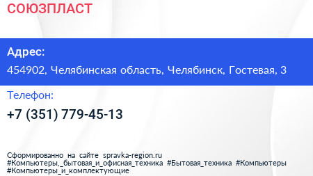 СОЮЗПЛАСТ по адресу 454902, Челябинская область, Челябинск, Гостевая, 3 в дальнейшем Организация, размещена в следующих категориях: