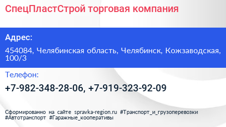 СпецПластСтрой, торговая компания по адресу 454084, Челябинская область, Челябинск, Кожзаводская, 100/3 в дальнейшем Организация, размещена в следующих категориях: