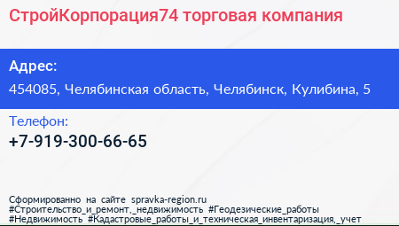 СтройКорпорация74, торговая компания по адресу 454085, Челябинская область, Челябинск, Кулибина, 5 в дальнейшем Организация, размещена в следующих категориях: