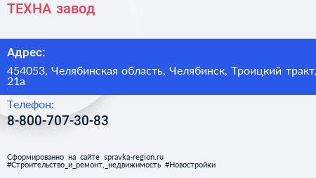 ТЕХНА, завод по адресу 454053, Челябинская область, Челябинск, Троицкий тракт, 21а в дальнейшем Организация, размещена в следующих категориях: