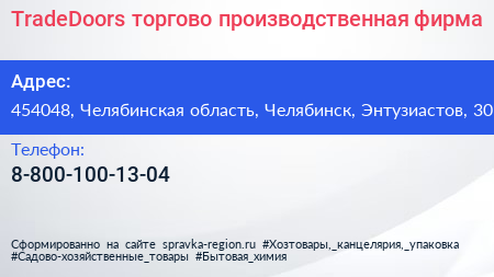 TradeDoors, торгово-производственная фирма по адресу 454048, Челябинская область, Челябинск, Энтузиастов, 30 в дальнейшем Организация, размещена в следующих категориях:
