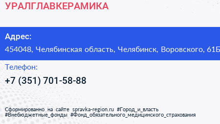 УРАЛГЛАВКЕРАМИКА по адресу 454048, Челябинская область, Челябинск, Воровского, 61Б в дальнейшем Организация, размещена в следующих категориях: