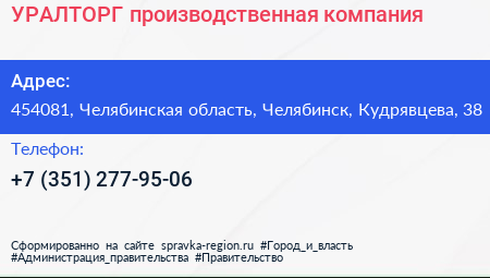 УРАЛТОРГ, производственная компания по адресу 454081, Челябинская область, Челябинск, Кудрявцева, 38 в дальнейшем Организация, размещена в следующих категориях: