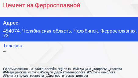 Цемент на Ферросплавной по адресу 454074, Челябинская область, Челябинск, Ферросплавная, 73 в дальнейшем Организация, размещена в следующих категориях: