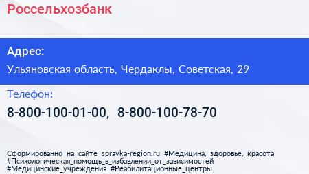 Россельхозбанк по адресу Ульяновская область, Чердаклы, Советская, 29 в дальнейшем Организация, размещена в следующих категориях: