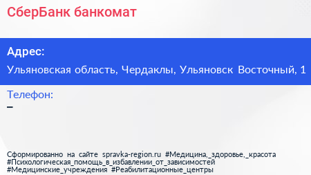 СберБанк, банкомат по адресу Ульяновская область, Чердаклы, Ульяновск Восточный, 1 в дальнейшем Организация, размещена в следующих категориях: