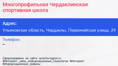 Многопрофильная Чердаклинская спортивная школа по адресу Ульяновская область, Чердаклы, Первомайская улица, 29 в дальнейшем Организация, размещена в следующих категориях: