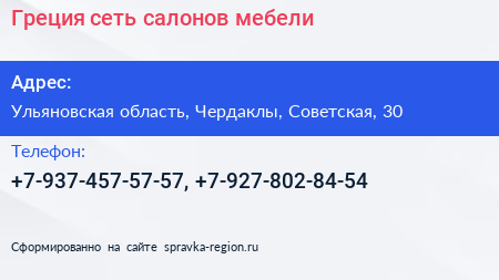 Греция, сеть салонов мебели по адресу Ульяновская область, Чердаклы, Советская, 30 в дальнейшем Организация, размещена в следующих категориях: