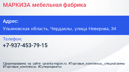 МАРКИЗА, мебельная фабрика по адресу Ульяновская область, Чердаклы, улица Неверова, 34 в дальнейшем Организация, размещена в следующих категориях: