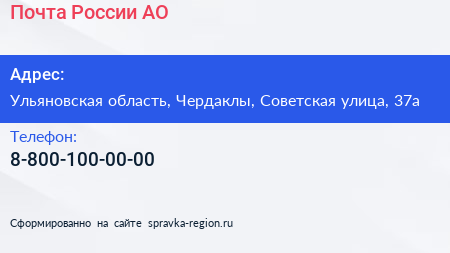 Почта России, АО по адресу Ульяновская область, Чердаклы, Советская улица, 37а в дальнейшем Организация, размещена в следующих категориях: