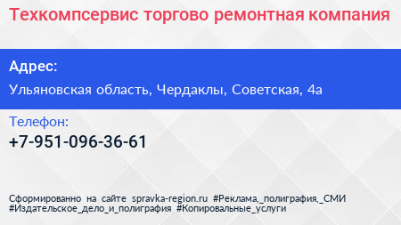 Техкомпсервис, торгово-ремонтная компания по адресу Ульяновская область, Чердаклы, Советская, 4а в дальнейшем Организация, размещена в следующих категориях: