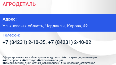 АГРОДЕТАЛЬ по адресу Ульяновская область, Чердаклы, Кирова, 49 в дальнейшем Организация, размещена в следующих категориях: