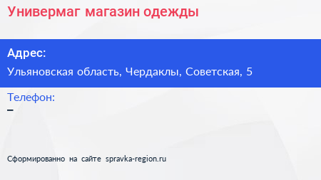 Универмаг, магазин одежды по адресу Ульяновская область, Чердаклы, Советская, 5 в дальнейшем Организация, размещена в следующих категориях:
