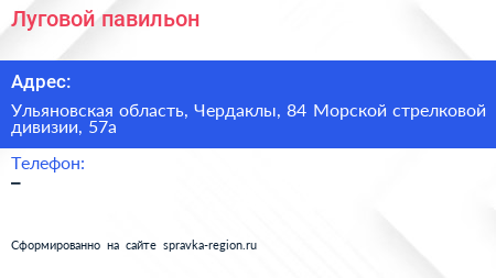 Луговой, павильон по адресу Ульяновская область, Чердаклы, 84 Морской стрелковой дивизии, 57а в дальнейшем Организация, размещена в следующих категориях:
