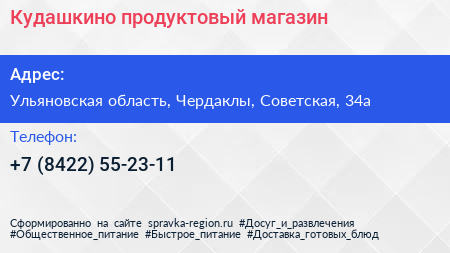 Кудашкино, продуктовый магазин по адресу Ульяновская область, Чердаклы, Советская, 34а в дальнейшем Организация, размещена в следующих категориях: